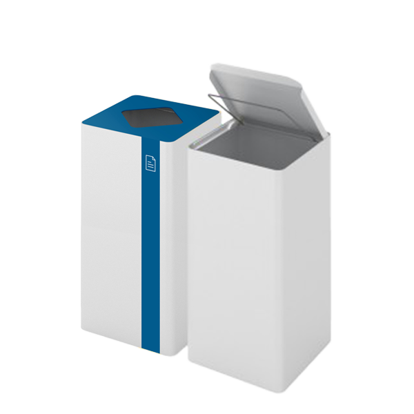 Elegant collection of recycling containers for waste sorting, available in four sizes, coming with lids with holes in different shapes and colours. Each container can be equipped with optional adhesive labels.